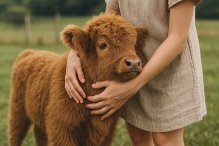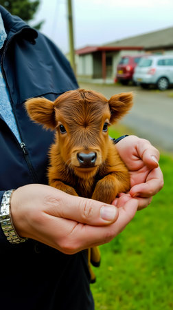 A young calf is cradled in a person's hands, showcasing its soft fur and big eyes. The setting appears serene and natural, highlighting the bond between human and animal during the day.