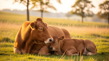 A tender scene of a mother cow and her calf resting together on the grass in a peaceful meadow. The golden hour sunlight illuminates their reddish-brown fur, highlighting the affectionate bond between the farm animals.