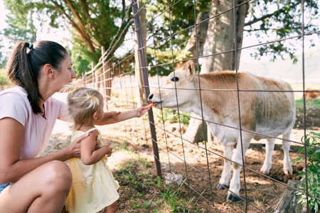 Little girl with her mother feeding a cow with carrots through the fence at the farm