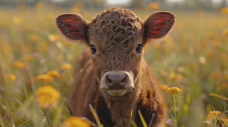 Curious calf exploring a meadow filled with vibrant flowers in early spring