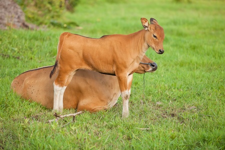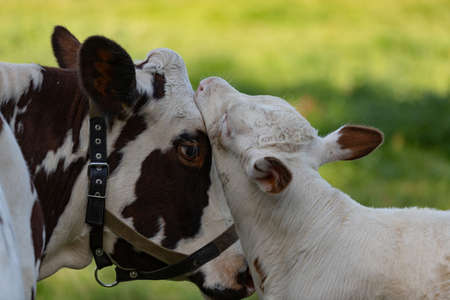 Adult cow with small calf close-up on grassy meadow background. High quality photo