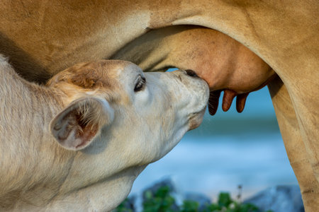 Adorable brown and white calf drinking milk from its mother cow in a lush pastoral farm landscape filled with grass nature and a serene countryside setting