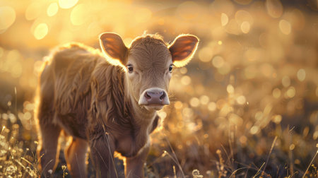 A pedigree calf standing by the farm barn, with soft rays of sunlight casting a warm glow over the scene.