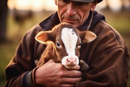 A farmer holds a newborn calf in his arms. Animal husbandry and agriculture. The birth of a calf on a small farm. Cattle breeding. Livestock farming in rural areas