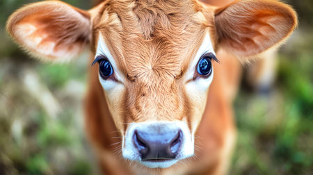 A playful calf gazes curiously with bright eyes, showing its charming expression in a vibrant natural setting.