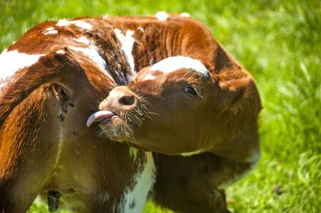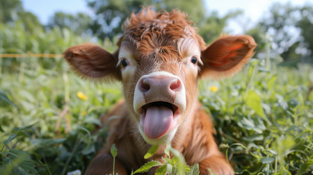 Close-up of a funny calf sticking out tongue in a field. Macro shot of farm life with a humorous tone.