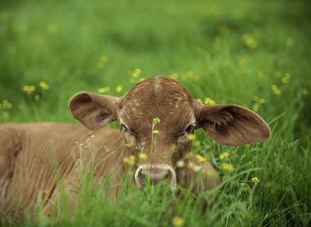 Young calf in the grass, half hidden by blurred grass and flowers, yellow flowers