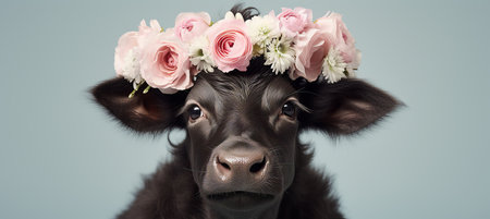 Styled happy dairy cattle on pastel background in studio fashion shot with copy space for text
