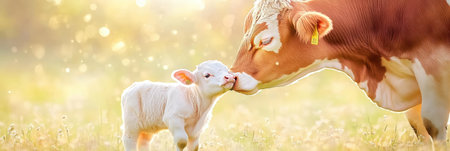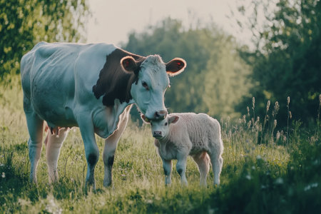 A heartwarming scene showcasing the bond between a mother cow and her calf in a lush green pasture. The soft light enhances their tender interaction, portraying tranquility.