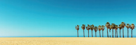 Golden sand meets the calm ocean under a bright blue sky, with tall palm trees lining the beach. Perfect for a sunny afternoon.