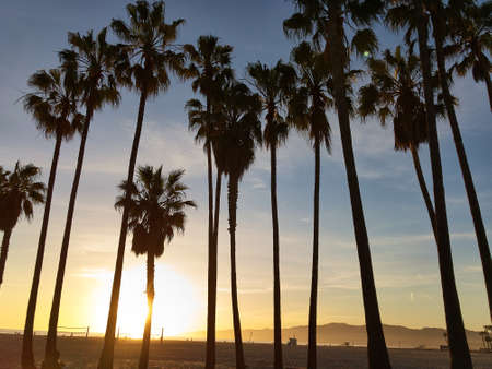 Palm trees on a background of blue sky at sunset in California