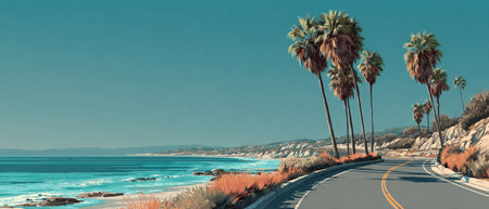 Scenic Coastal Highway with Palm Trees and Ocean .Generative AI