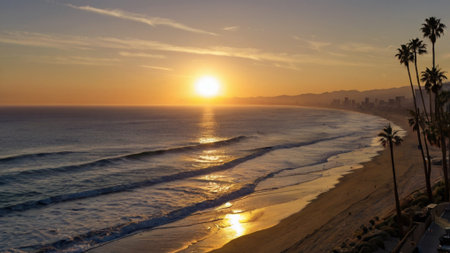 Golden sunset over calm waves at a coastal beach with cliffs and palm trees in the background on a serene evening
