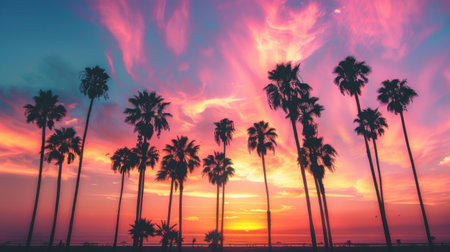 Silhouettes of palm trees against a vibrant sunrise sky, a scene of serenity and tranquility as nature awakens to the dawn.