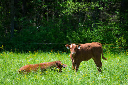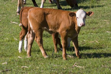 Cute calf in a farm. Calf in the countryside. Farm life with cattle and calves. Little calf in a rural farmland. Bovine animals. Farming with cattle.
