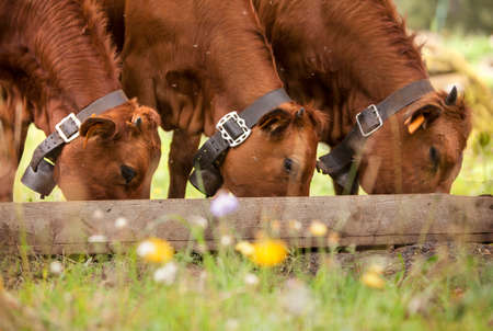 Just having a bit of a drink. two cow calves drinking milk out of a through outside during the day.