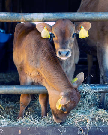 Young calf in a nursery for cows in a dairy farm. Newborn animal. No peple.