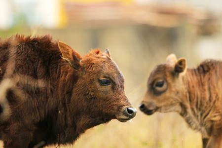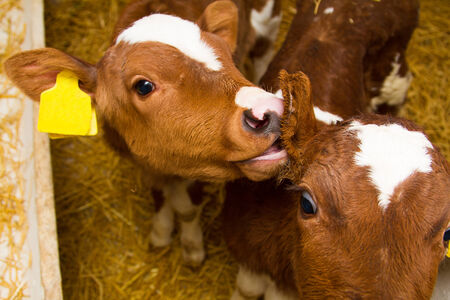 Cows in farm. Calf play happily. Dairy cows. selective focus.