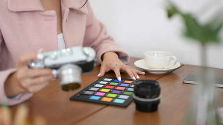 Cropped image, Professional millennial female freelance photographer or blogger checking her camera and colour-checker.