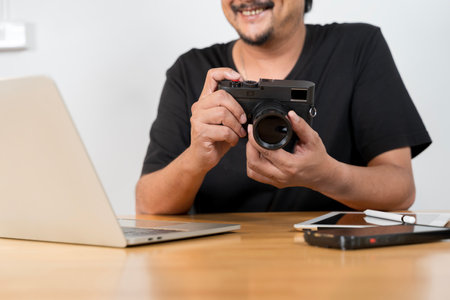 Camera and several camera lens on coffee table. Happy retirement life, hobbies and interests for the elderly concept. Senior Asian man cleaning and checking camera at home.