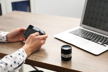 Photographer or stock photography concept, digital black camera in hands near laptop close up