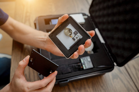 Repairman taking photo of disassembled smartwatch to depict details positions