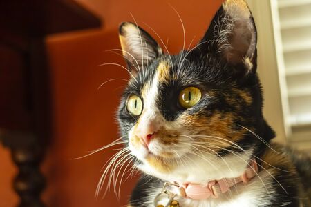 Portrait of a tricolor cat with beautiful yellow eyes.