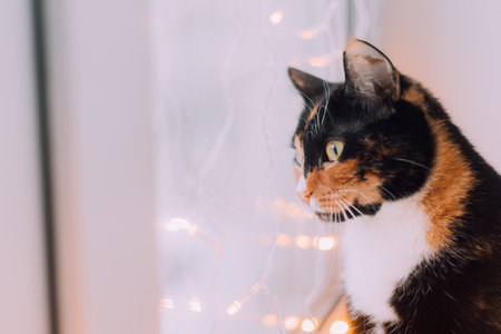 The house cat is sitting on the window with a garland. Pets. New Year's Eve mood. New Year's mood. Home decoration. Gifts for pets. Article about New Year and Christmas