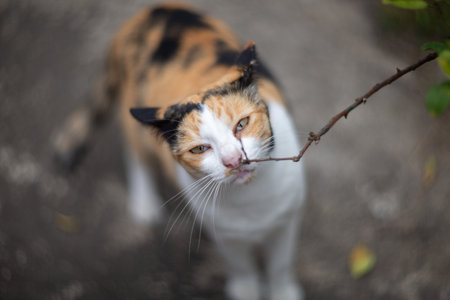 Close up of a cat with a stick in its mouth. Selective focus.