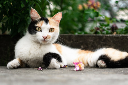 Cat lying on the concrete floor with flowers in the garden, Thailand.