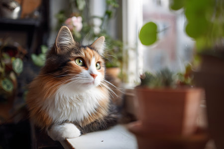 A charming fluffy calico cat resting on a window sill, surrounded by green ivy. This serene and peaceful scene showcases the cat's beautiful markings and curious gaze.
