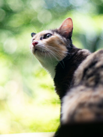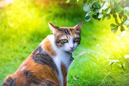 portrait of cute calico cat with green eyes with nature green bokeh background.
