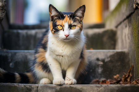 The Graceful Calico: A Stairway Encounter in Shades of Gray 3:2 AR
