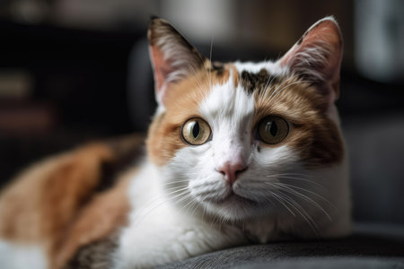Domestic and cute tricolor cat posing at the camera while lying at home.