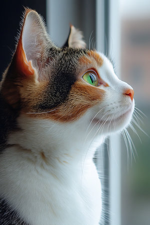 Curious Calico Cat Gazing Out Window, Feline Portrait with Vibrant Colors, Natural Light