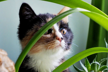 a beautiful and cute kitten, three-haired in plants.