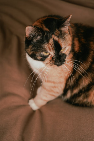 The feline's calm demeanor and sleek fur create a cozy and warm atmosphere. Resting on a brown sheet, a calico cat with vibrant green eyes captivates with its tri-colored coat.