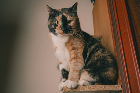 Its attentive gaze and upright posture add a regal charm. The minimalistic background highlights its beauty. A calico cat sits proudly on a wooden shelf, its orange, black, and white fur gleaming.