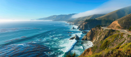scenic road trip down the coast with rolling waves and scenic views, created with generative ai