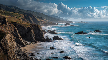 A serene view of the Pacific coastline with cliffs and crashing waves. No people, copy space.