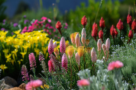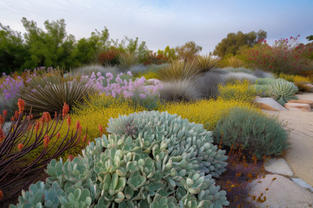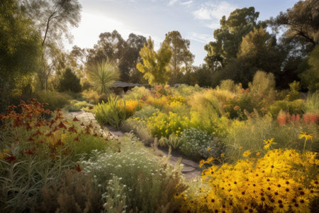 a garden with drought-tolerant and native plants, surrounded by beautiful blooming flowers, created with generative ai