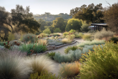 relaxing garden with drought-tolerant and native plants, surrounded by natural surroundings, created with generative ai