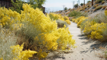 Low-angle, sunlit view of a narrow, sandy pathway bordered by abundant, vibrant yellow flowering bushes, suggesting a trail through an arid or desert environment with sparse surrounding vegetation and utility poles visible in the distance on the upper slope.