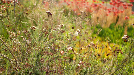 field with wild dried grass, flower and spikelets beige close up on blurred background Wilted nature and trend concept Autumn season.