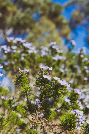 Australian native plant with tiny blue lillac flowers and spiky leaves shot at shallow depth of field