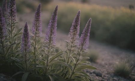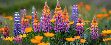 A golden sunrise illuminates vibrant lupine flowers, with a soft focus creating a tranquil and dreamy atmosphere in this serene natural landscape