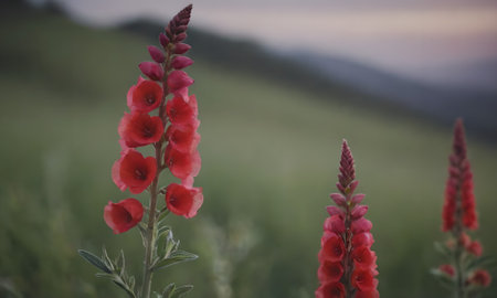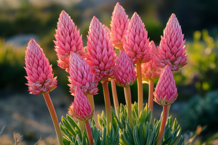 Colorful pink flowers stand tall in a lush garden, illuminated by soft sunlight during the golden hour. This serene moment captures natures beauty and tranquility.