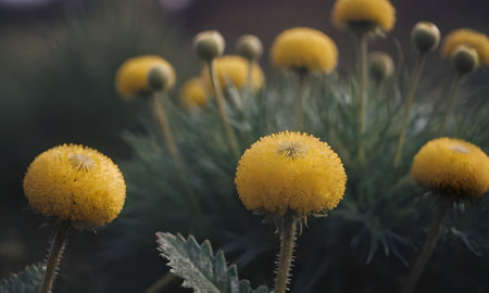 Close-up view of a cluster of bright yellow flowers, with a soft focus on the surrounding plants and foliage. The image showcases the detailed textures and colors of the flowers and their environment.
