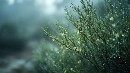 The Ephedra in light fog, dew on leaves, light soft diffused, three-quarter view