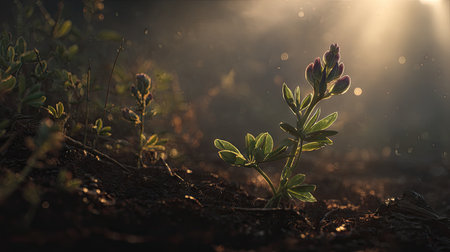 A cinematic wide shot of a young Lupine growing, slightly larger than before, surrounded by rich, dark soil and faint morning mist, golden sunlight breaking through the clouds, soft beams illuminating the growing plant, ultra-realistic photography with true Earth like realism natural hues, no artificial colors, cinematic composition, deep 3D parallax depth creating an immersive, awe inspiring atmosphere, subtle natural lens flares, minimal 35mm film grain, tranquil and hopeful tone, 8K, highly detailed.